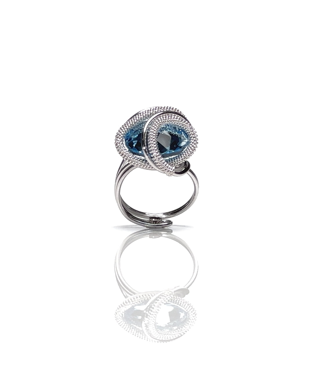 Anello compatto e luminoso che unisce la brillantezza del blu chiaro alla finitura argentata. Al centro, un cristallo Swarovski color acquamarina, tagliato a goccia, riflette la luce con tonalità limpide e definite. La struttura in metallo rodiato, aperta e proporzionata, accompagna il cristallo con linee leggere ed equilibrate, garantendo stabilità e comfort.