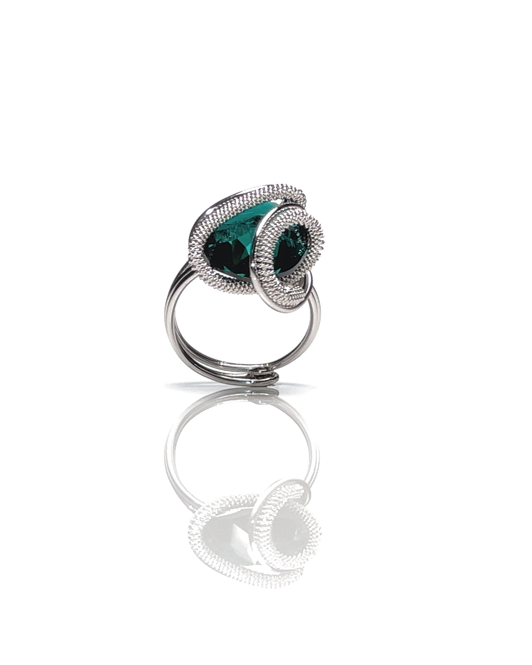 Anello compatto ed essenziale che valorizza l’intensità del colore. Al centro, un cristallo Swarovski verde, tagliato a goccia, riflette la luce con profondità e brillantezza definite. La struttura in metallo rodiato, aperta e proporzionata, accompagna il cristallo con linee leggere ed equilibrate, offrendo stabilità e comfort.