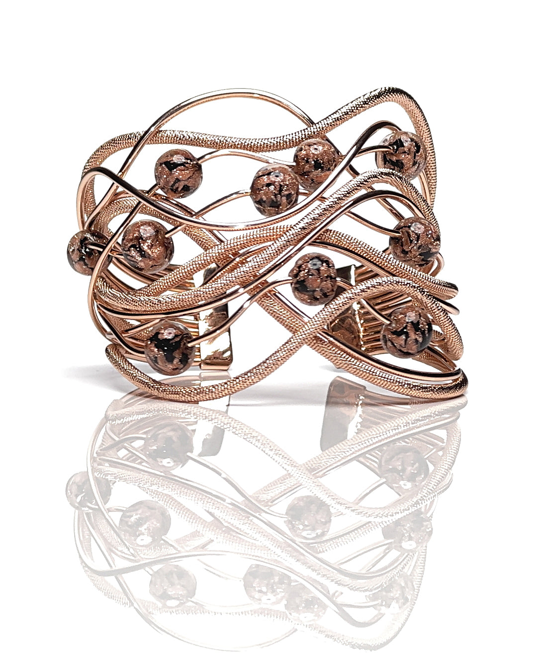 Bracciale scenografico e tridimensionale, realizzato in metallo placcato oro rosa 18K con intreccio fluido modellato a mano. La struttura, ampia e articolata, accoglie 10 sfere in vetro soffiato nero dai riflessi profondi e iridescenti, creando un contrasto elegante tra luce calda e materia scura. Le linee sinuose si sviluppano su più livelli, per un effetto armonico e avvolgente. La chiusura a pressione assicura stabilità e comfort.