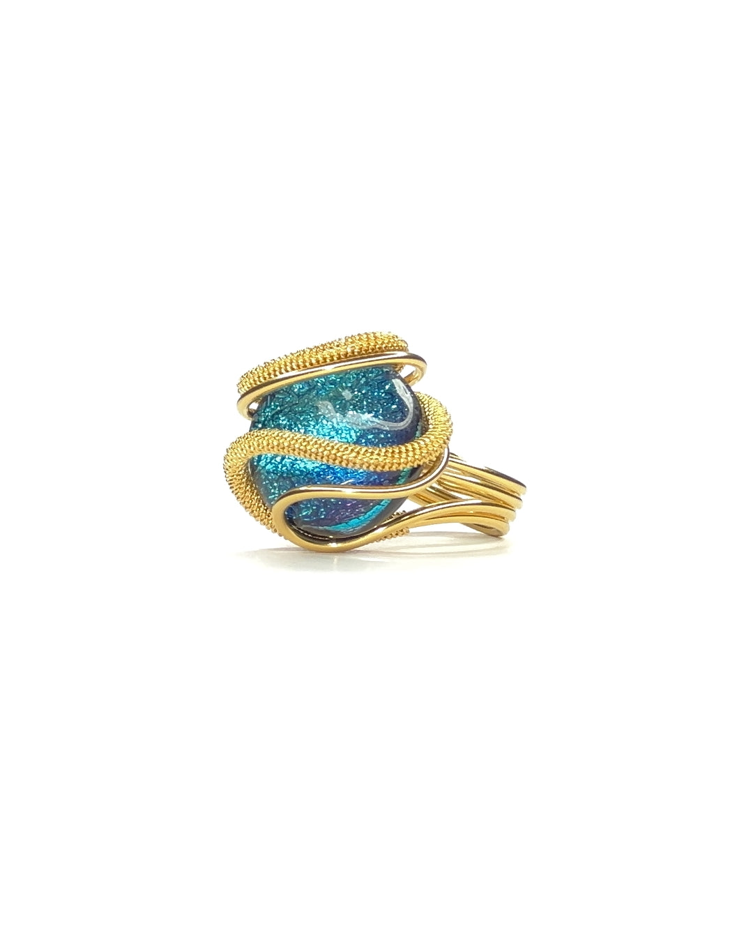 Un anello compatto e bilanciato che unisce intensità cromatica ed equilibrio formale. Al centro, una sfera in vetro dichroico blu riflette la luce con riflessi cangianti. La struttura in metallo placcato oro 24K avvolge la sfera con linee proporzionate e armoniose, seguendo il profilo del dito con naturalezza.