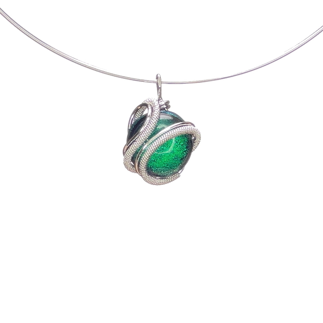 Riflessi verdi racchiusi in una forma essenziale. La sfera in vetro dicroico verde, dai toni cangianti, è incorniciata da una struttura di metallo rodiato che ne valorizza la luminosità.