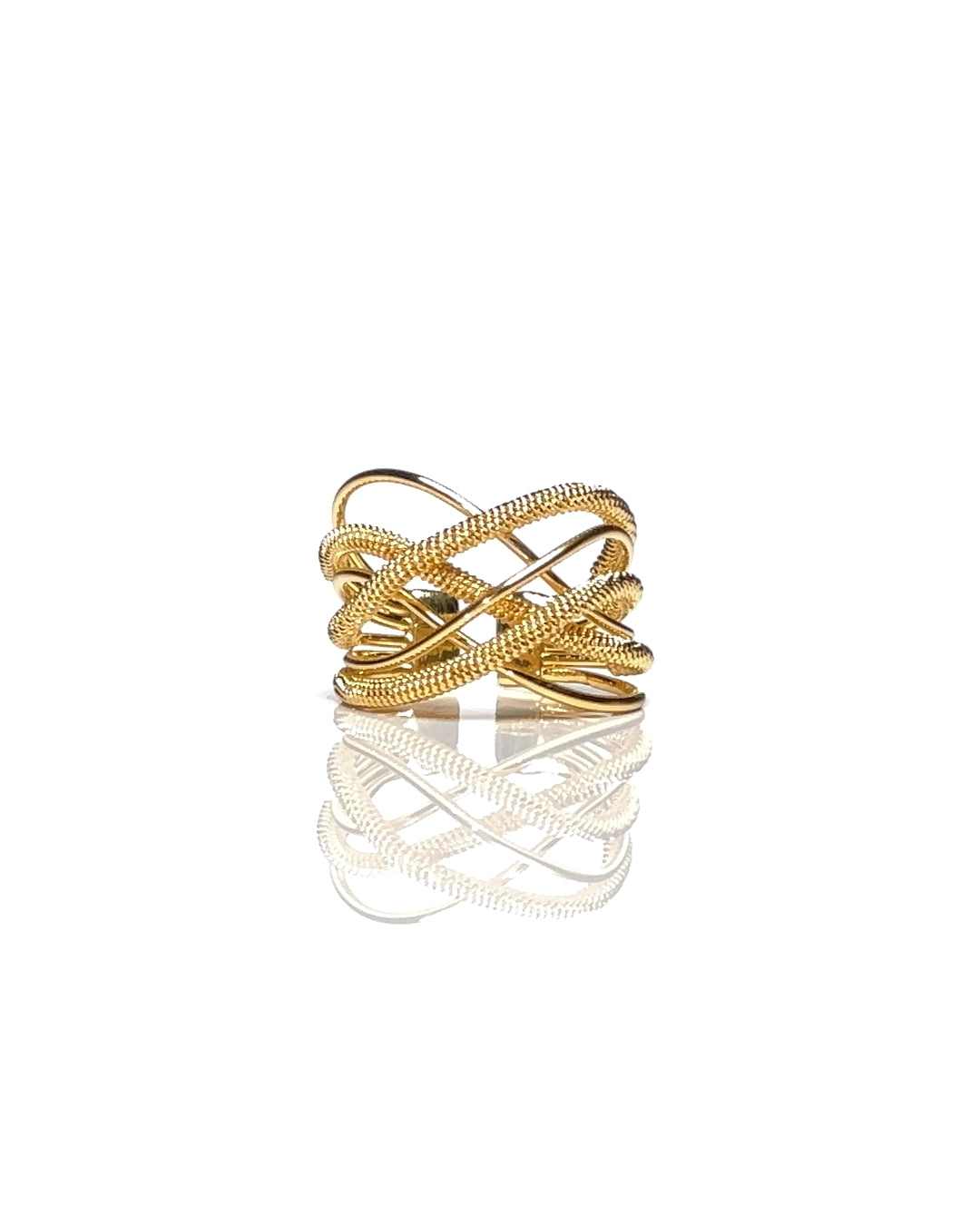 Anello compatto e raccolto, costruito su una struttura in metallo placcato oro 24K che alterna linee intrecciate e superfici lisce. Il contrasto tra texture e brillantezza definisce una forma stabile e dinamica, che si concentra attorno a un nucleo suggerito ma non visibile.