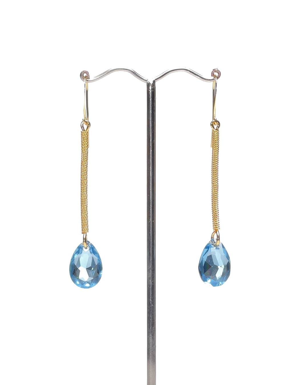 Orecchini slanciati e leggeri che uniscono freschezza cromatica ed eleganza discreta. Un cristallo Swarovski acquamarina, dalla forma allungata e sfaccettata, riflette la luce con delicatezza sospeso all’estremità di un elemento rigido finemente intrecciato in metallo placcato oro 24K. Il design sottile ed equilibrato esalta la luminosità naturale dell’azzurro.