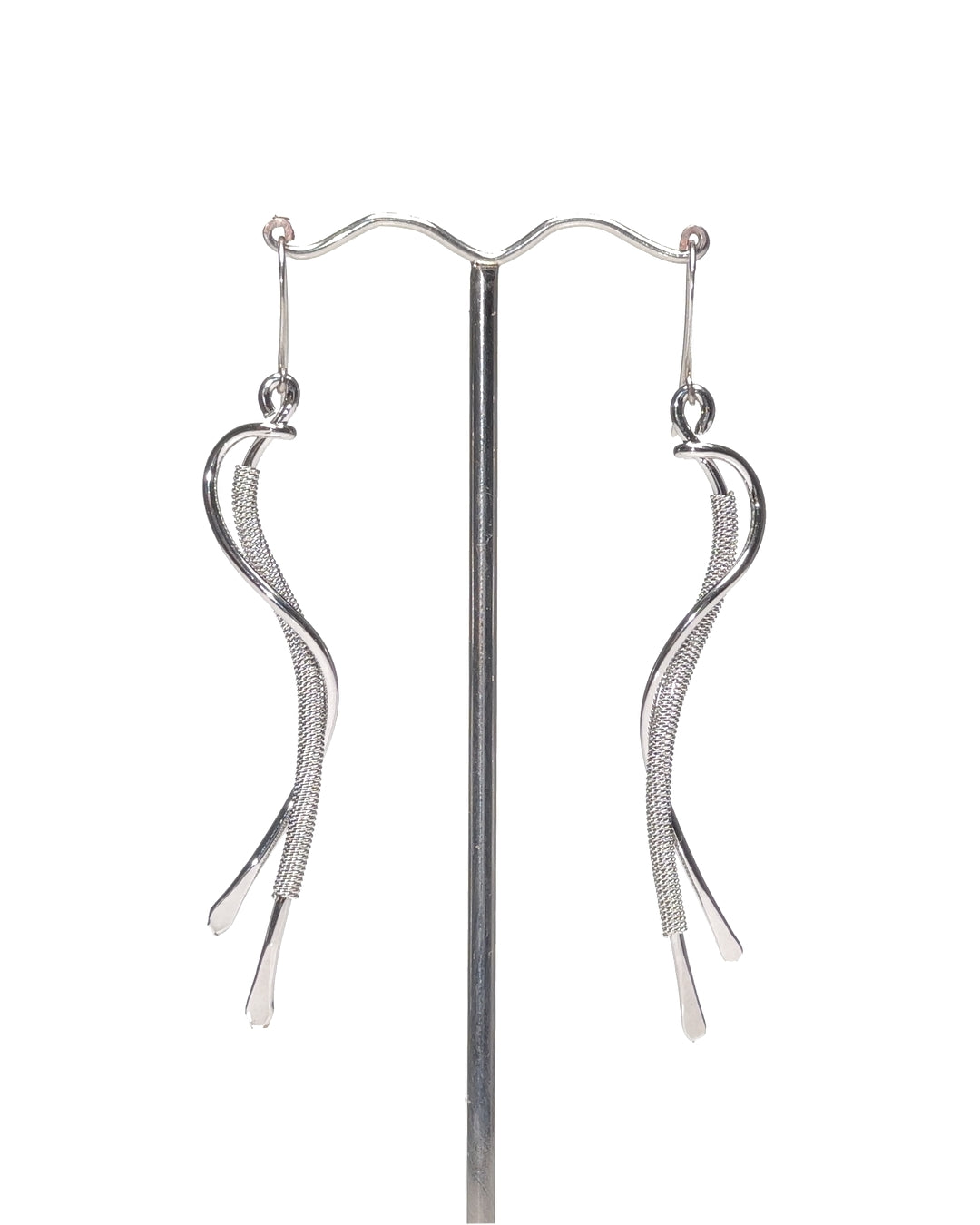 Orecchini che interpretano la leggerezza formale attraverso linee fluide e asimmetriche. La struttura in metallo rodiato è composta da due elementi sinuosi che si intrecciano in un movimento delicato, alternando superfici lisce e tratti intrecciati per creare un ritmo naturale e dinamico. Il design, slanciato e armonioso, accompagna il volto con eleganza essenziale.