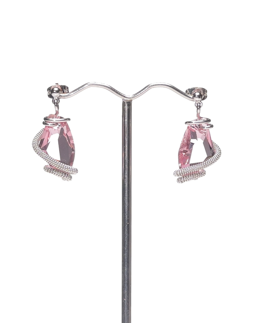 Orecchini compatti e raffinati con un design essenziale. Al centro, un cristallo color rosa riflette la luce con tonalità delicate e brillanti. La struttura in metallo rodiato avvolge il cristallo con linee armoniose e proporzionate, definendo una forma sobria ed equilibrata.