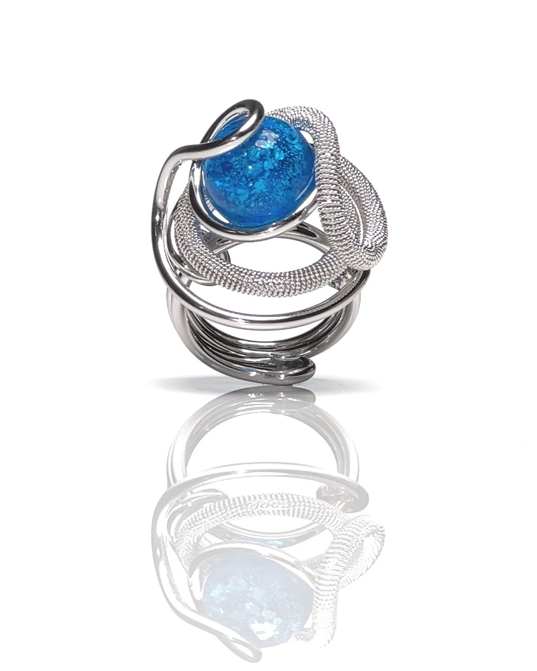Anello di grande presenza che unisce volumi scolpiti e intensità cromatica. La struttura in metallo rodiato si sviluppa con linee continue e curve generose che avvolgono una sfera in vetro soffiato blu, capace di riflettere la luce con profondità e creare un effetto visivo ricco di contrasti. La brillantezza fredda del metallo dialoga con la tonalità intensa del vetro, dando vita a una composizione equilibrata e decisa.