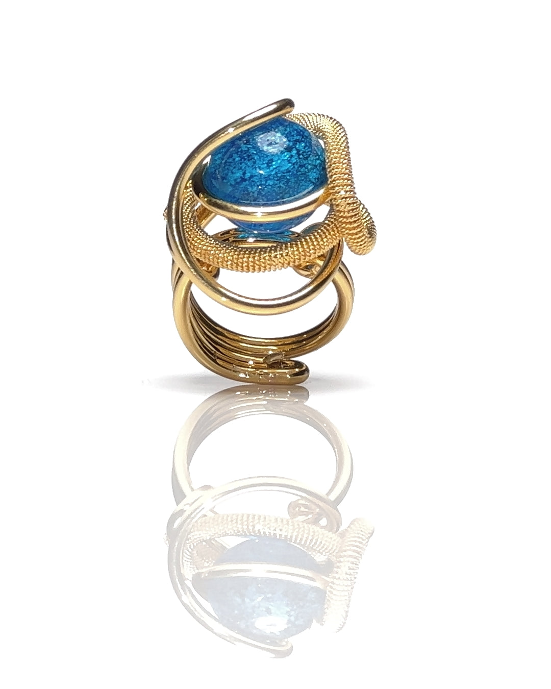Anello di grande presenza che unisce volumi pieni e linee continue in un disegno avvolgente. La struttura in metallo placcato oro 24K accoglie una sfera in vetro soffiato blu, capace di riflettere la luce con profondità e brillantezza. Il contrasto tra la tonalità intensa del vetro e la luminosità calda dell’oro crea un equilibrio visivo forte ma armonico.
