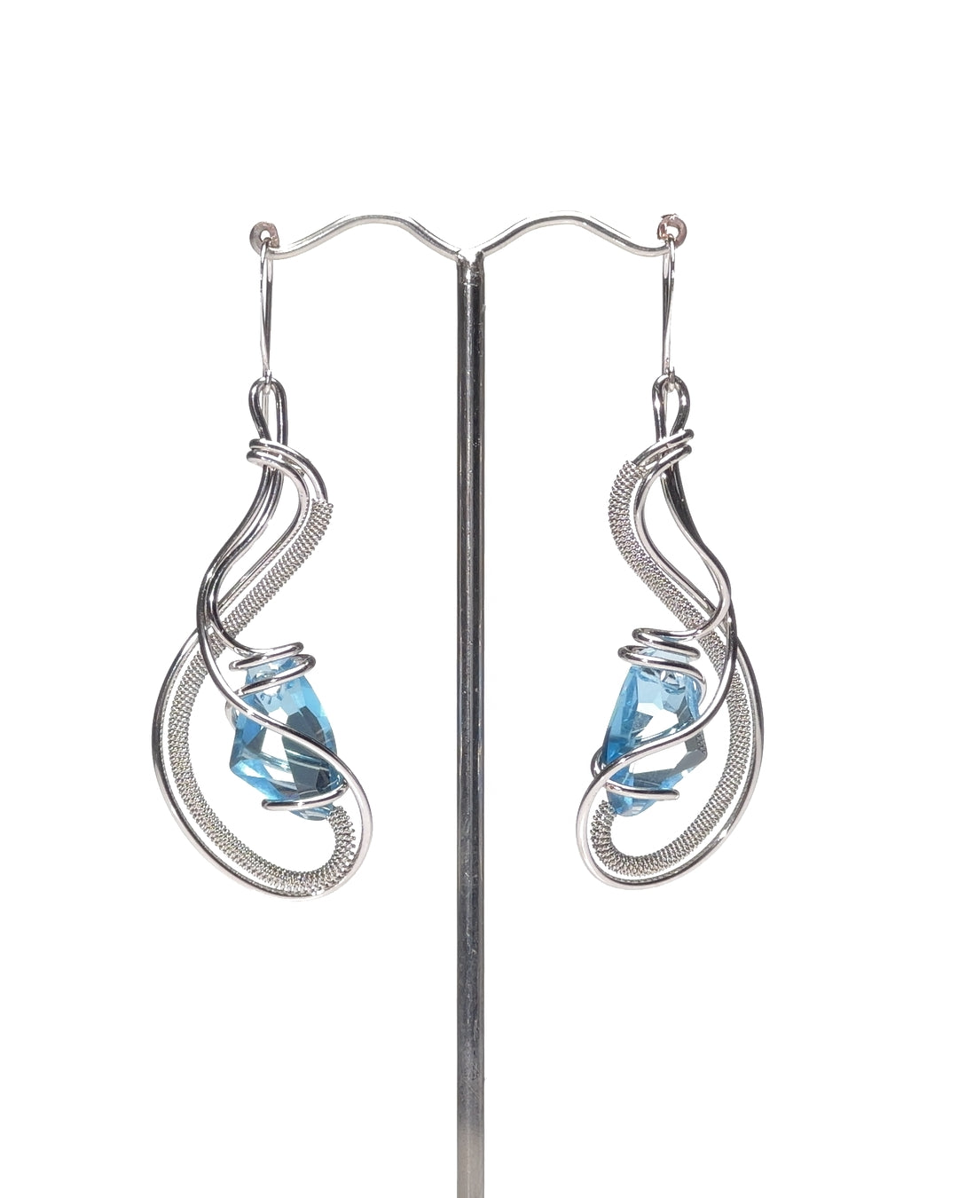 Orecchini slanciati ed eleganti che uniscono sinuosità e luminosità in un disegno essenziale. Un cristallo acquamarina, con taglio sfaccettato, è incastonato tra due curve in metallo rodiato che ne esaltano la brillantezza con armonia e proporzione. La verticalità raffinata accompagna il volto con equilibrio e delicatezza.