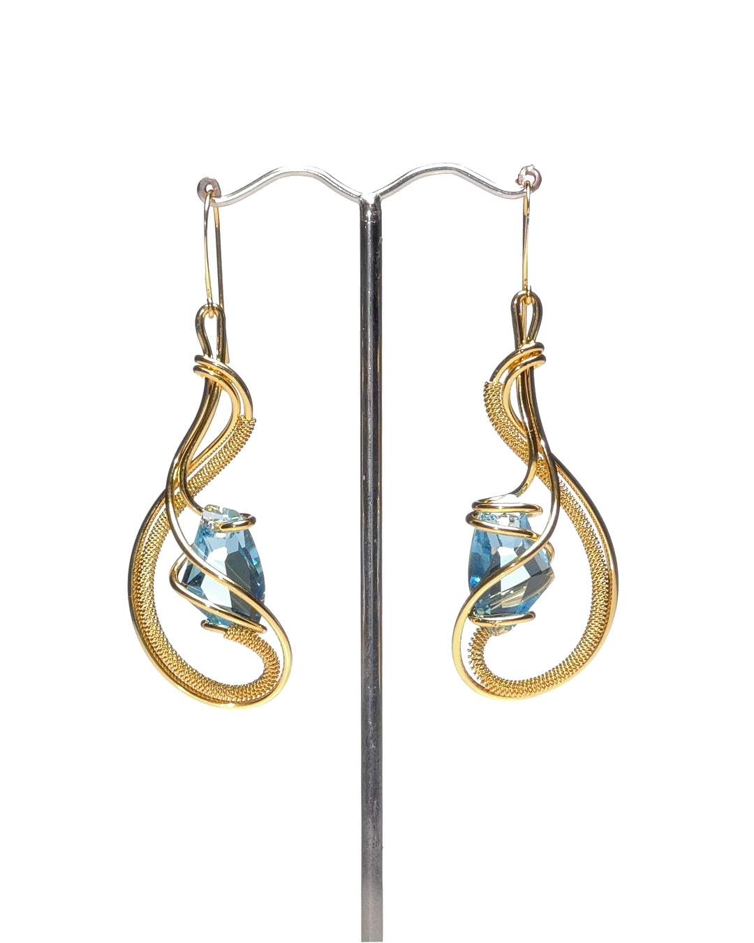 Orecchini slanciati ed eleganti che uniscono freschezza cromatica e calore dorato in un disegno armonioso. Un cristallo acquamarina, con taglio sfaccettato, è incorniciato da due curve in metallo placcato oro 24K che ne valorizzano la brillantezza con equilibrio e proporzione. La verticalità sinuosa accompagna il volto con raffinatezza e luce chiara.