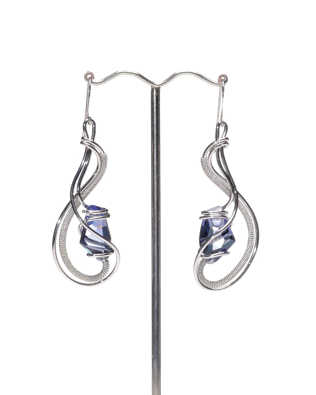 Orecchini slanciati ed eleganti che uniscono verticalità e luce intensa in un disegno raffinato. Un cristallo ametista, con taglio sfaccettato, è incorniciato da due curve in metallo rodiato che ne valorizzano le tonalità viola con brillantezza e armonia. La forma proporzionata accompagna il volto con leggerezza e carattere.