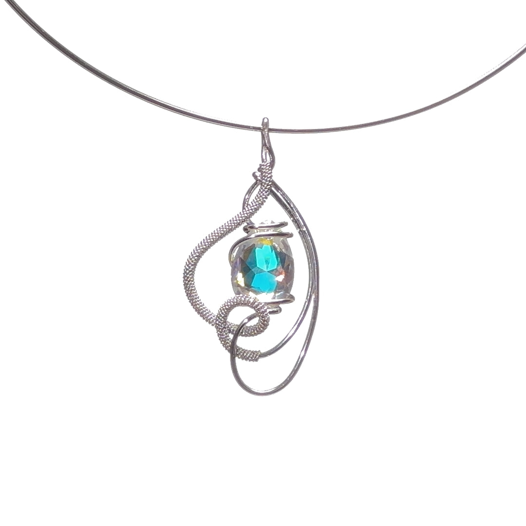 Un ciondolo raffinato e luminoso che unisce riflessi cangianti ed equilibrio formale. Il cristallo Swarovski Aurora riflette tonalità mutevoli di rosa, azzurro, oro e verde, incastonato in una struttura in metallo rodiato dalle linee intrecciate e fluide che accompagnano la luce con armonia.